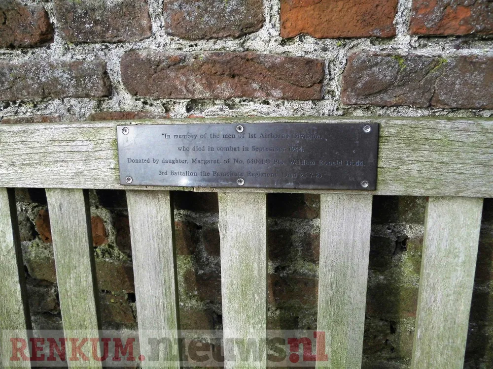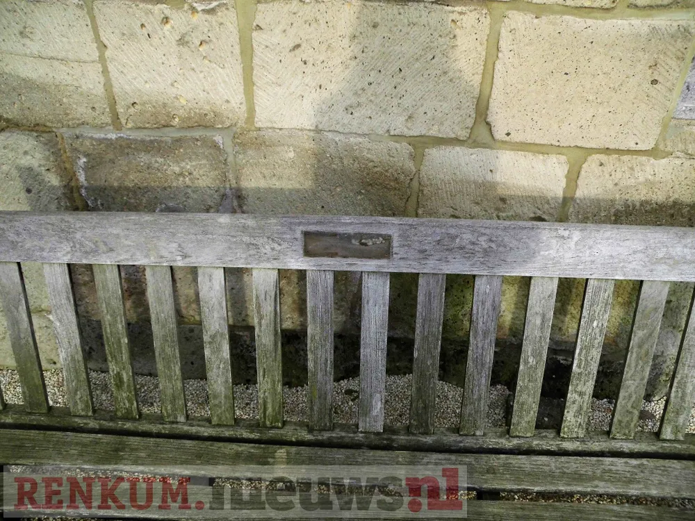 Drie herinneringsplaatjes die bevestigd waren op de houten bankjes die achter de Oude Kerk in Oosterbeek staan zijn verdwenen. Een vierde is iets verbogen maar zit er nog op.