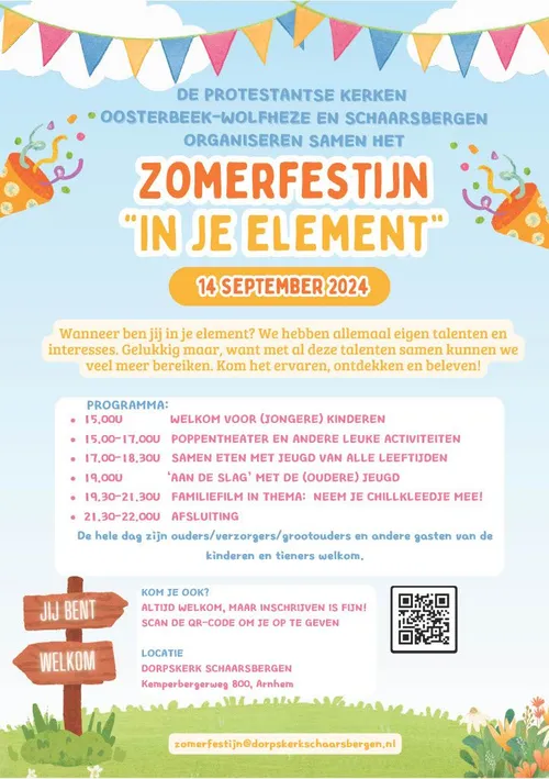 Het Zomerfestijn op zaterdag 14 september wordt rond de Dorpskerk in Schaarsbergen gehouden en is voor alle jeugd. Het thema is: “In je element”.