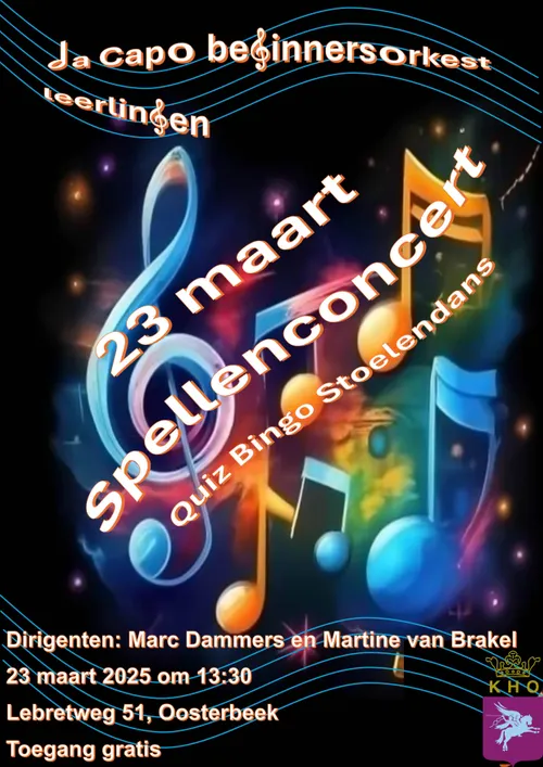 De leerlingen, het Beginnersorkest en het opleidingsorkest Da Capo van de KHO geven een concert waaraan je actief mee kunt doen met onder andere een online quiz, een stoelendans en een ritme memorie. Muziek van o.a. James Bond, Queen en Claude Kiambe maken het feest compleet.