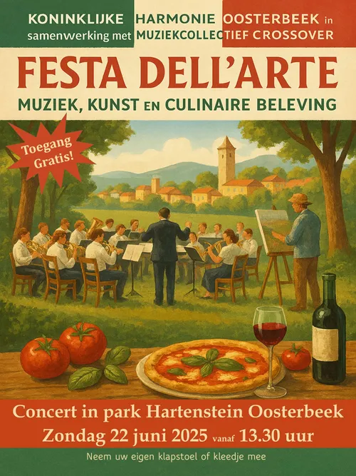 Koninklijke Harmonie Oosterbeek presenteert "Festa Dell’Arte" – Een Italiaans parkconcert vol muziek, kunst en culinaire verwennerij. Op zondagmiddag 22 juni vanaf 13.30 uur verandert Park Hartenstein in Oosterbeek in een Italiaans cultureel feest tijdens het jaarlijkse parkconcert van de Koninklijke Harmonie Oosterbeek (KHO).