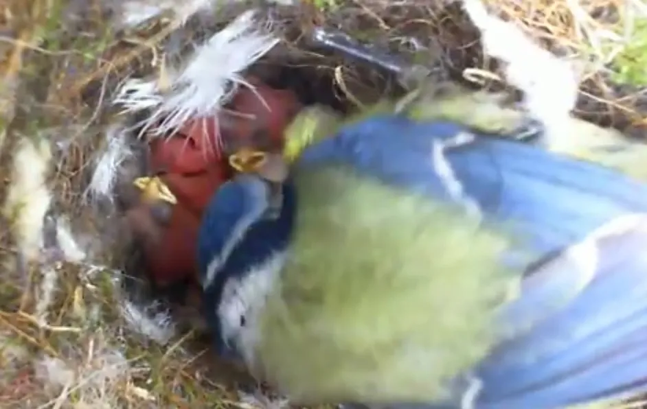 Op YouTube kun je live meekijken. Vader en moeder pimpelmees vliegen de hele dag af en aan, duiken in het nest en voeren de hongerige snaveltjes. Als ze op jacht zijn kruipen de jonge vogeltjes dicht tegen elkaar aan en kwetteren zachtjes met nog dichte oogjes. Dat verandert zodra ze moeder of vader horen.