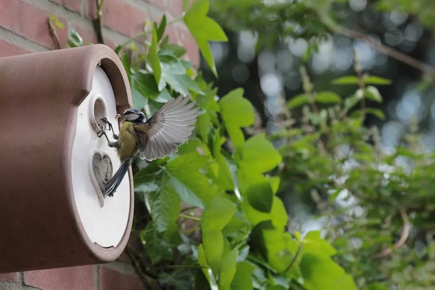Nanning uit Doorwerth maakte een paar jaar geleden een mezenkast. Vorige jaar zat er een nest koolmeesjes in, nu een nestje pimpelmeesjes. Je kunt ze zien opgroeien door de webcam die in het huisje zit.