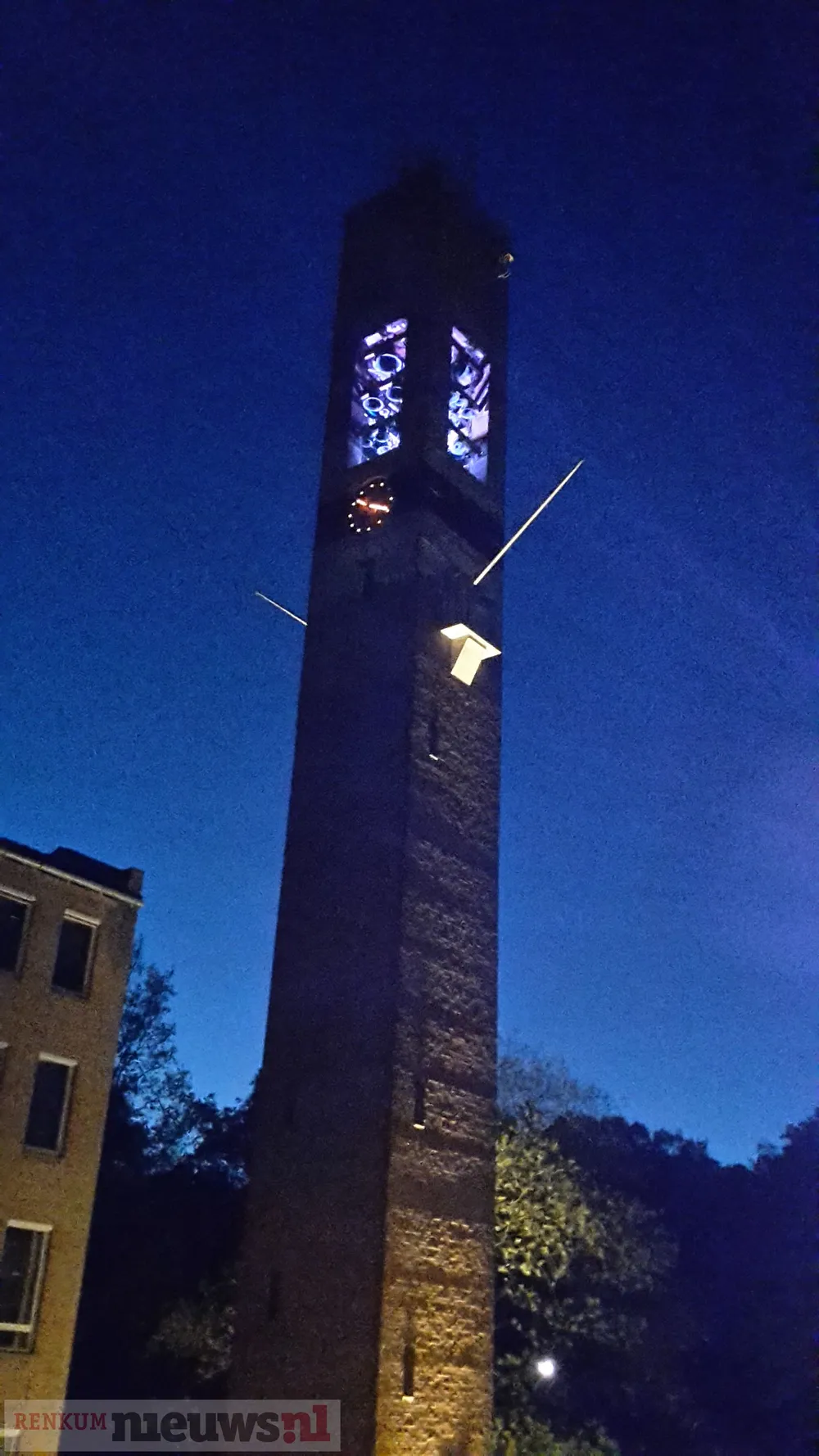 Vanavond kijken de medewerkers hoe de verschillende kleuren de toren en het carillon laten stralen. Het carillon staat uit....tenminste, dat was de bedoeling. Maar om 22:00 begint ie toch te spelen. Mooi.