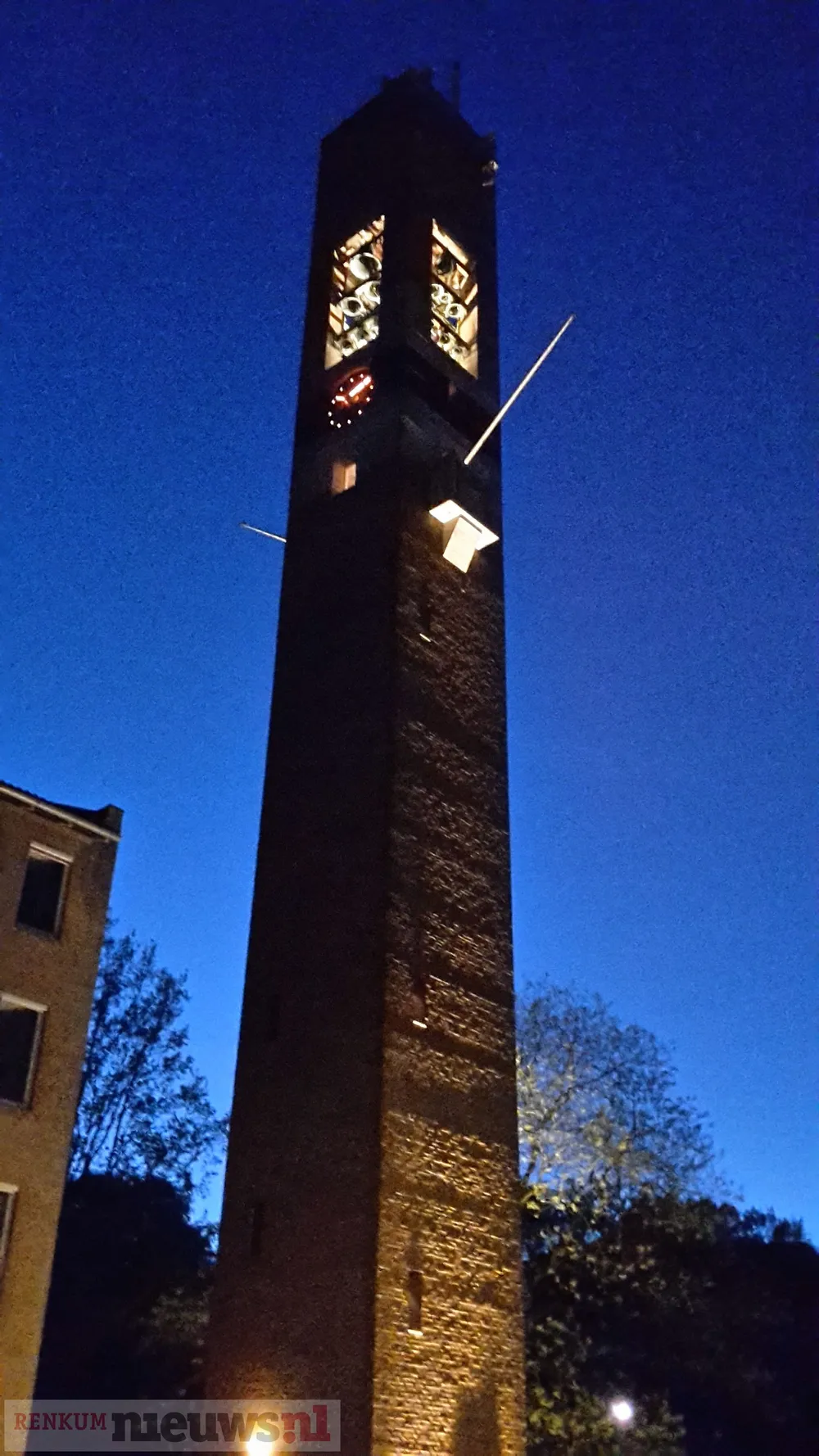 Overdag zie je er niks van maar nu er verlichting van onderen af op de toren gericht staat, zijn er duidelijke lijnen te zien in het metselwerk, op de foto lijkt het zelfs alsof de toren beschreven is.